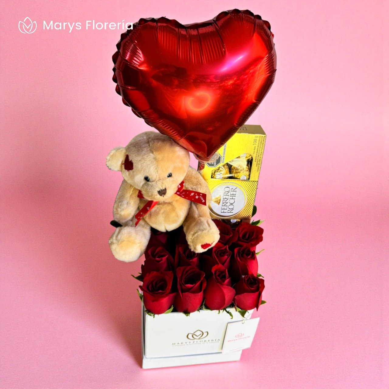 - Contenido: 12 rosas rojas + bombones Ferrero Rocher + Pequeño Oso y globo metálico n° 9