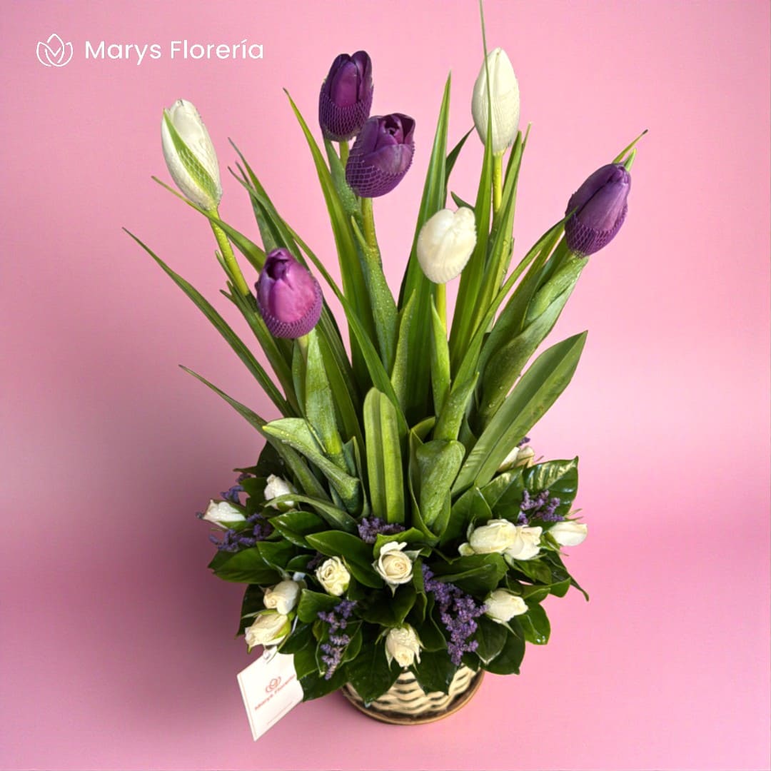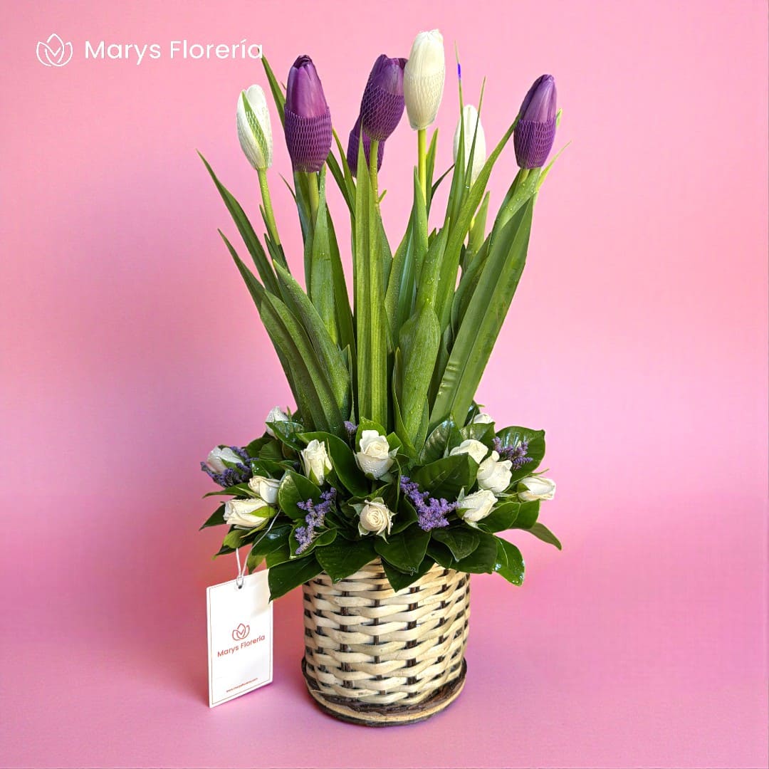 - Arreglo Floral en cesta de mimbre con 7 tulipanes de colores