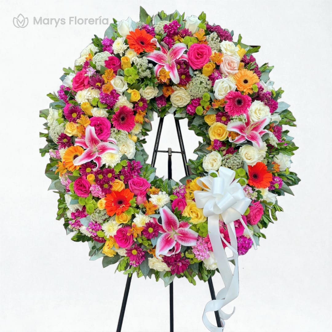 Corona elaborado con flores primaverales rosas, gerberas y liliums en colores variados.