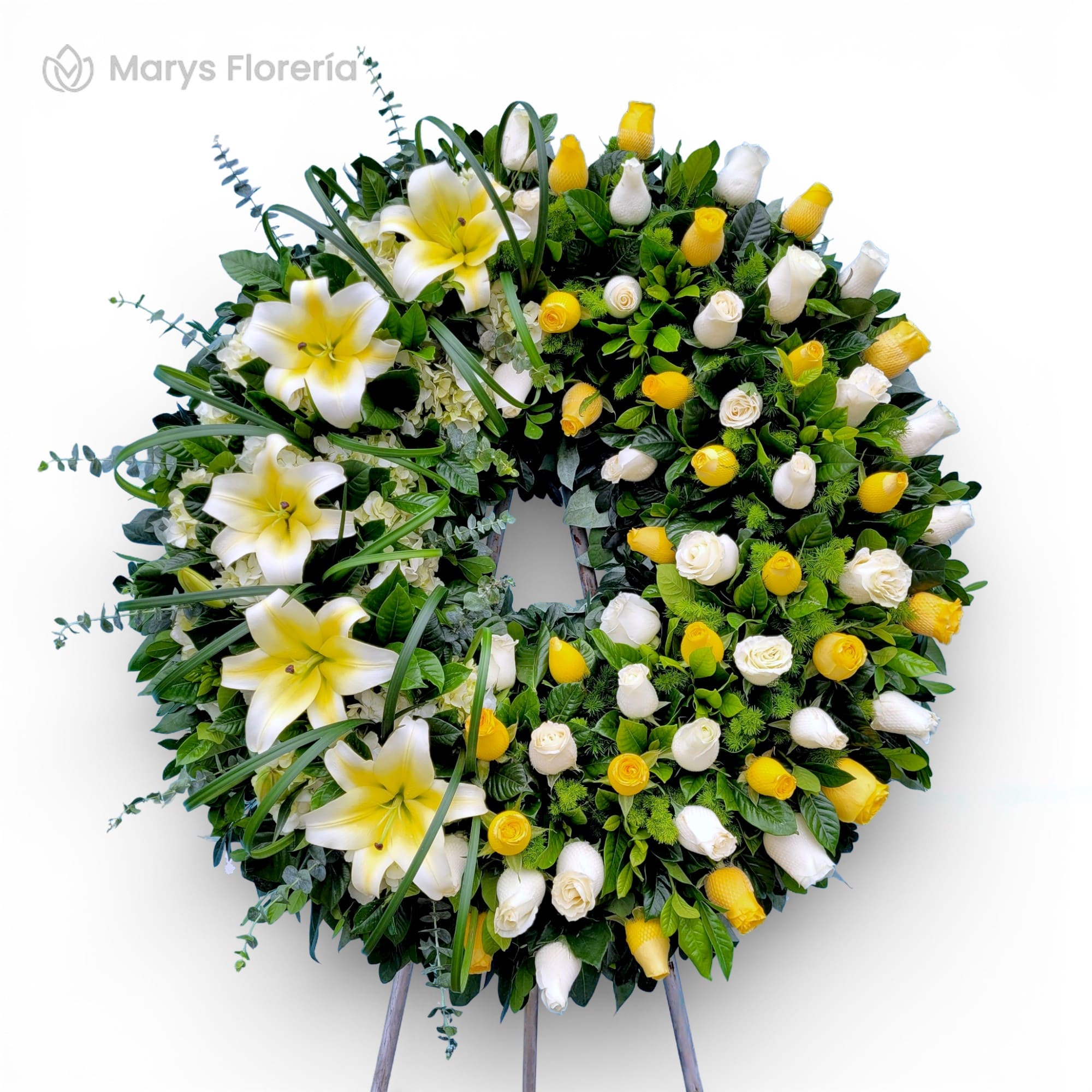 Corona premium elaborada con una fina combinación de 60 rosas en color amarillo y blanco, logrando una composición equilibrada que transmite paz, pureza y armonía.
