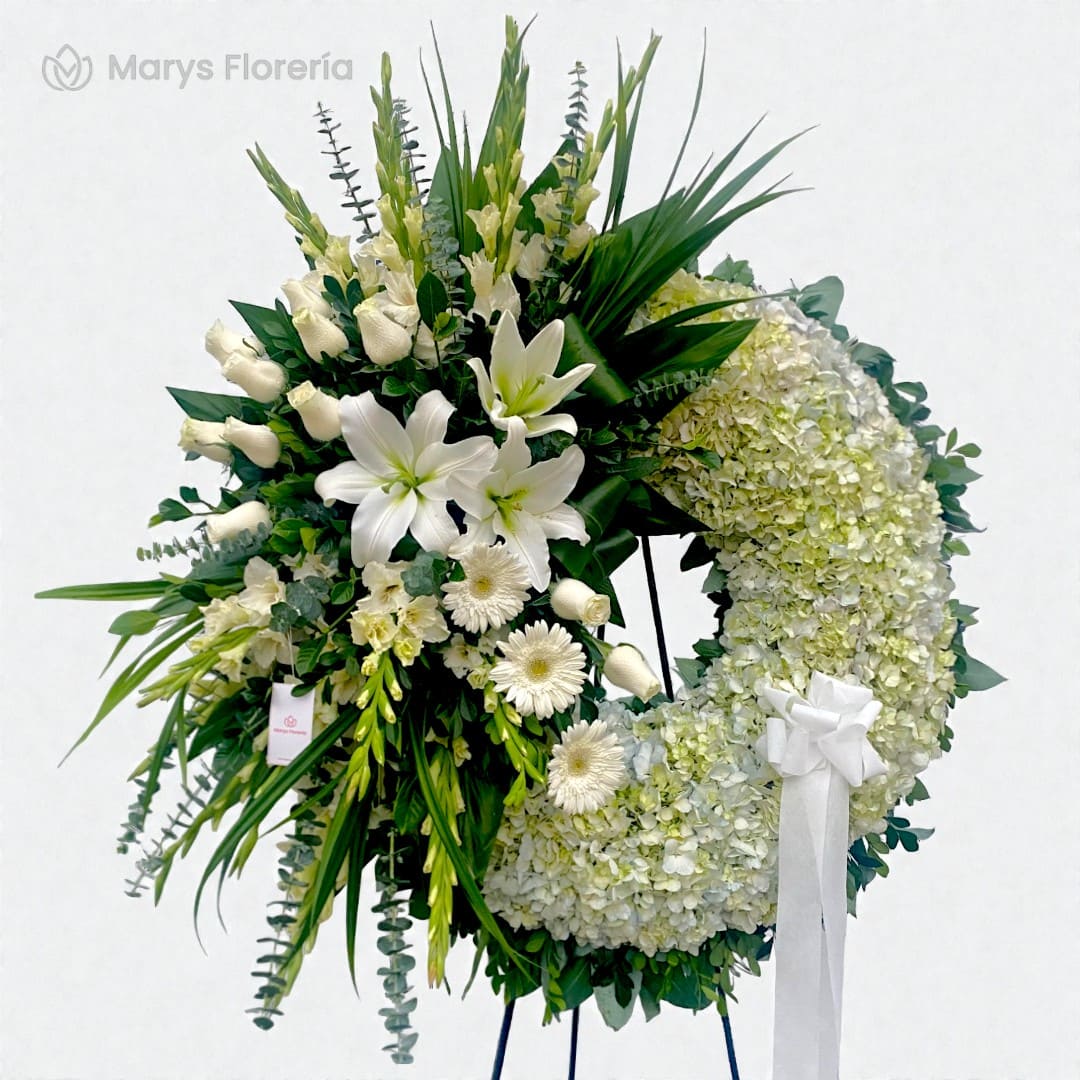 • Hortensias naturales y Lilium blanco complementada de follajes verdes según disponibilidad.