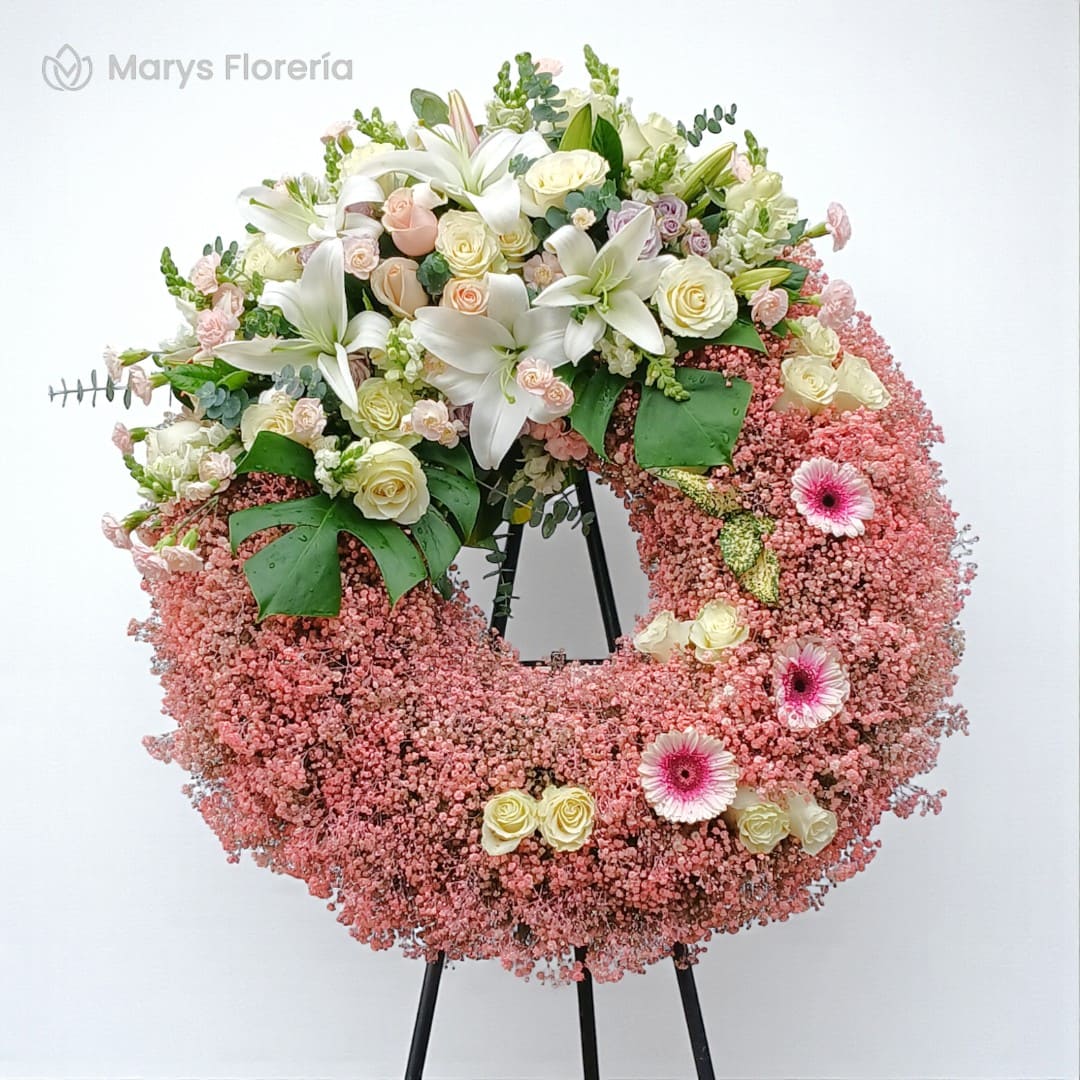 Corona premium elaborada con una fina combinación de 24 rosas en colores blancas y rosadas, logrando una composición equilibrada que transmite paz, pureza y esperanza.