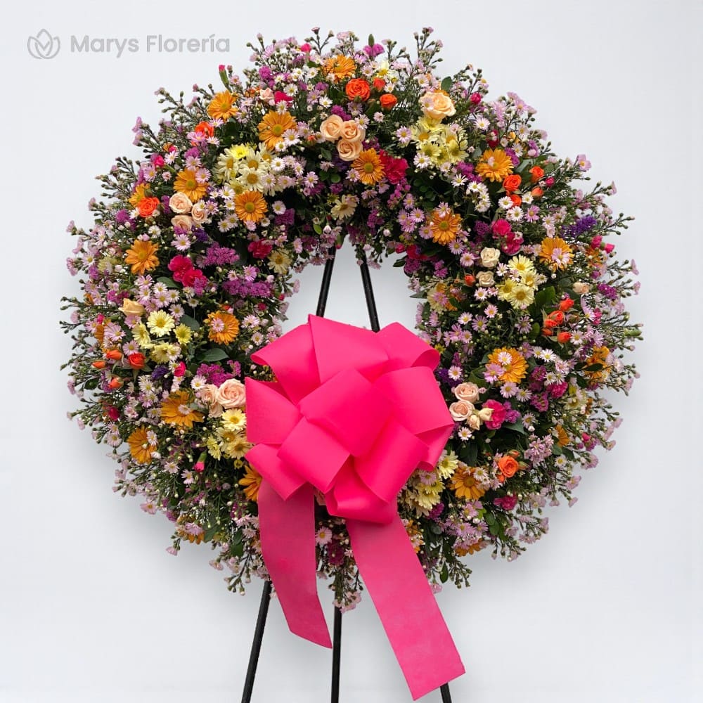 • Arreglo fúnebre multicolor  complementado con follajes y moña de tela decorativa