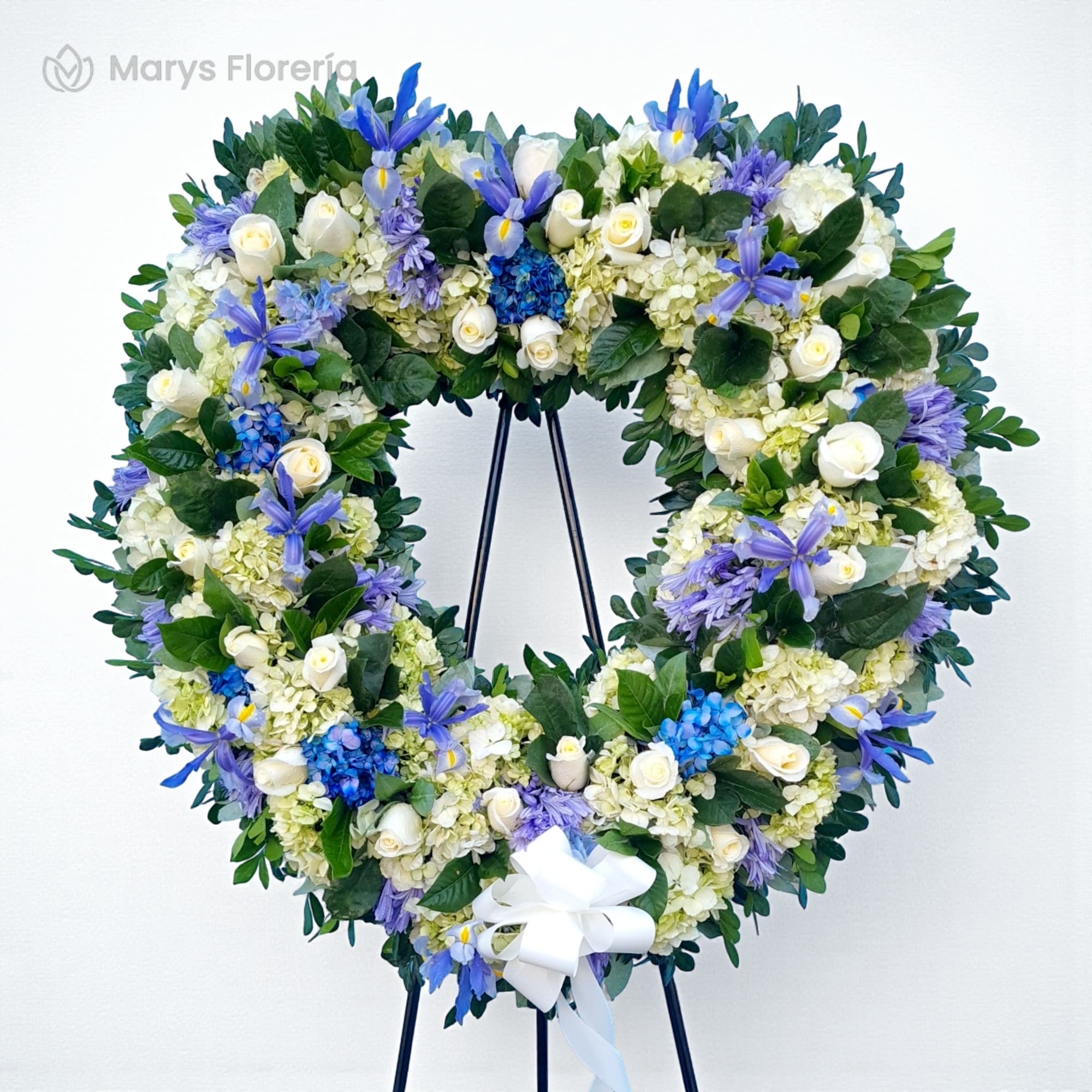 • Hortensias naturales e iris complementada de follajes verdes según disponibilidad.
