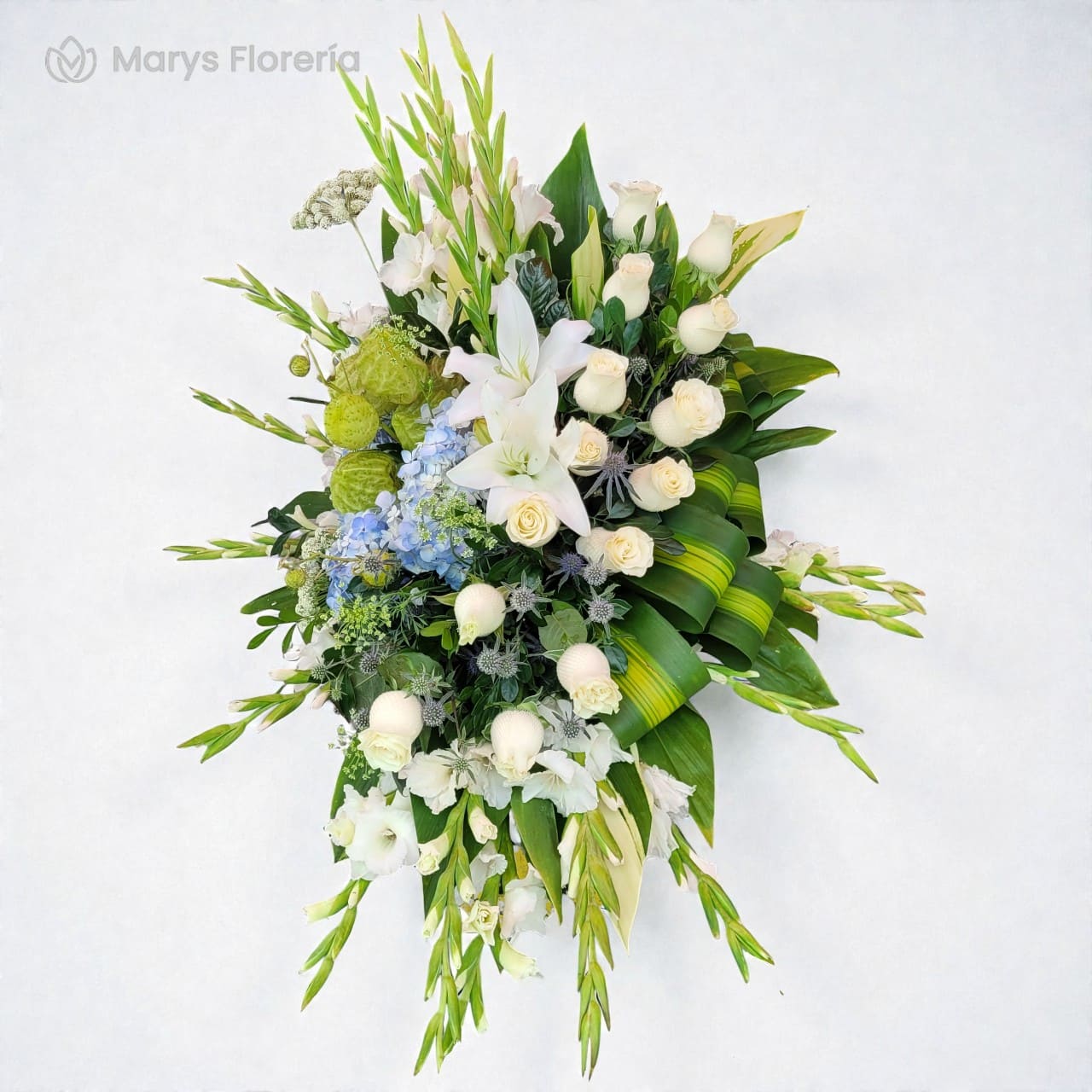 - 12 rosas, gladiolos,hortensia celeste complementadas de un mix de verdes según disponibilidad.
