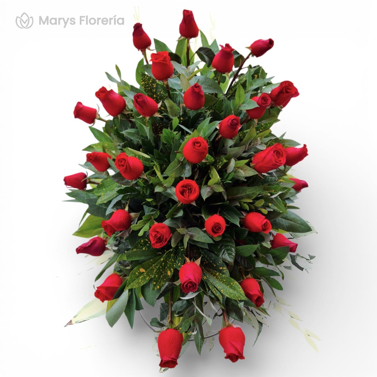 - 30 rosas rojas complementadas de un mix de verdes según disponibilidad.