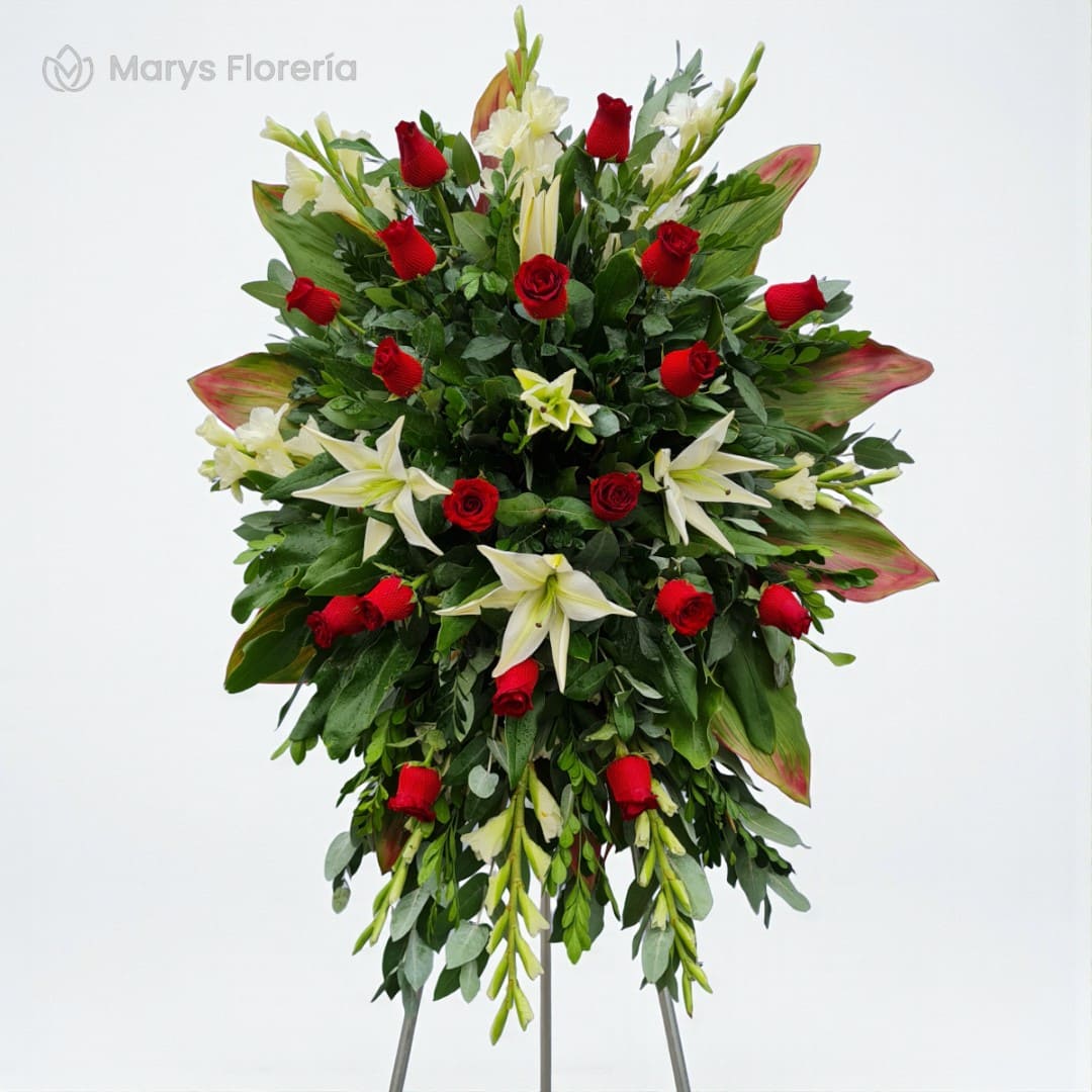 - 24 rosas rojas complementadas de lilium blanco y un mix de verdes según disponibilidad.